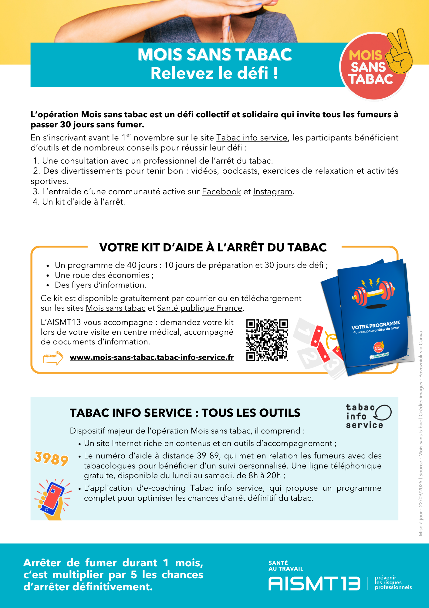 Chaque année, notre service de prévention et de santé au travail participe activement à cette campagne positive et bienveillante. Dès le mois d’octobre et tout au long du mois de novembre, nos équipes se mobilisent dans les centres médicaux pour sensibiliser les fumeurs à l’arrêt du tabac. Elles proposent notamment des kits de soutien pour aider chacun à franchir le pas. Pour en savoir plus, vous pouvez contacter votre centre médical.